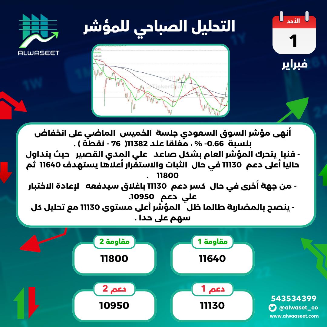 الإغلاق أنهى مؤشر السوق السعودي جلسة اليوم الثلاثاء على ارتفاع بنسبة 0.99 % ، مغلقا عند 11382( 111 + نقطة ) .